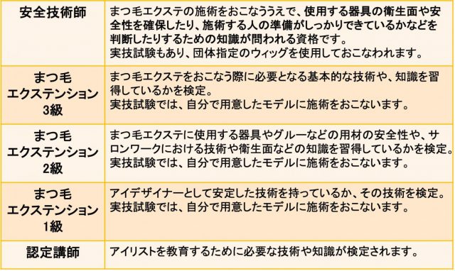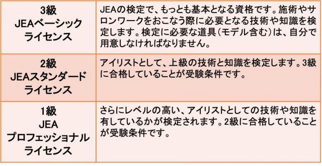 「日本アイリスト協会(JEA) 技能検定試験」も、アイリストとして施術をおこなううえでの技術と知識を検定する試験です。資格は以下の3種類で構成されています。