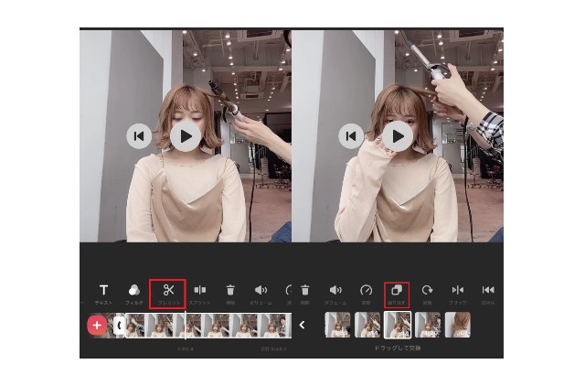 お客様の髪をヘアアイロンで巻いているシーンを選んだり、お客様と話しているシーンを選んだり、あえて完成カットを選んだりすることもありますね。どのシーンも、動画の中でモデルさんがどれぐらい印象が変わるかをお客様に期待していただくシーンを選んでいます。タイトルのシーンを決めたら、『プレイカット』で切り取り、『繰り返す』を選択して複製します。サムネイルを決めたら、動画の尺が1分以内になるように編集を加えていきます。