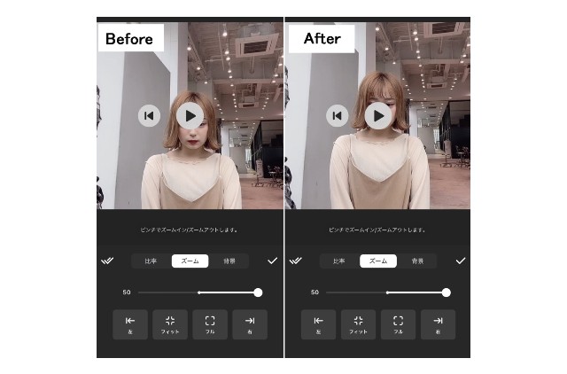 それから、モデルさんを強調するために、『ズーム』を50まで上げ、顔を画面中央より、やや上に調整しています。加えて、自己ブランディングのために、僕が映り込むスペースを動画の両端に空けることもしています。
