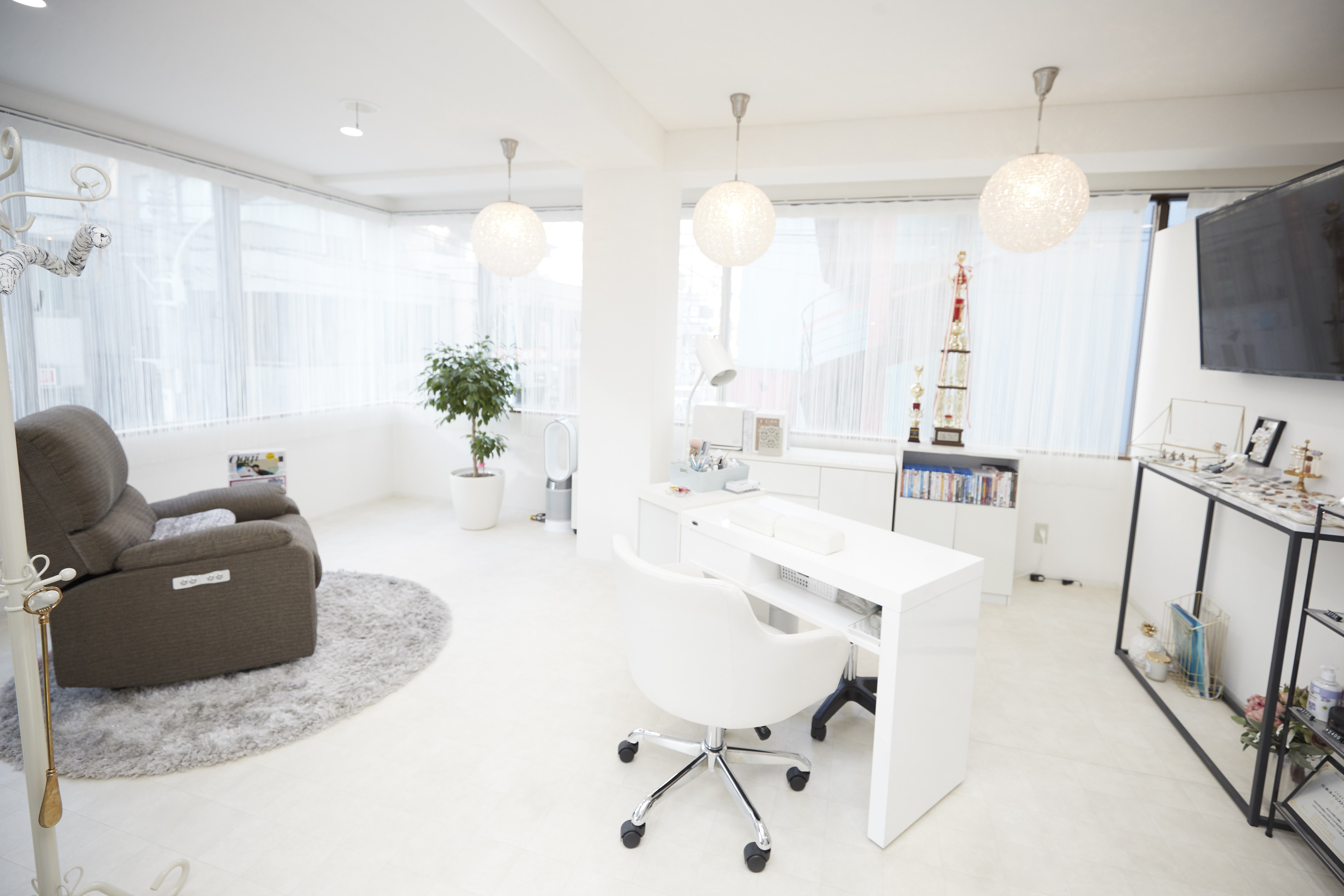 その年代の方はお仕事や子育てに忙しい方が多いので、サロンのコンセプトは『癒やしの空間を作ること』です。プライベートサロンはマンションの一室でも営業できますが、サロンにいる間は非日常感を味わってほしくて、広めのテナントを探しました。この場所は大きな窓と広々とした室内が特徴で、外から目立ち、中はリラックスできる空間になっています。どんな方でも落ち着いて過ごせるように内装は白で統一しました」