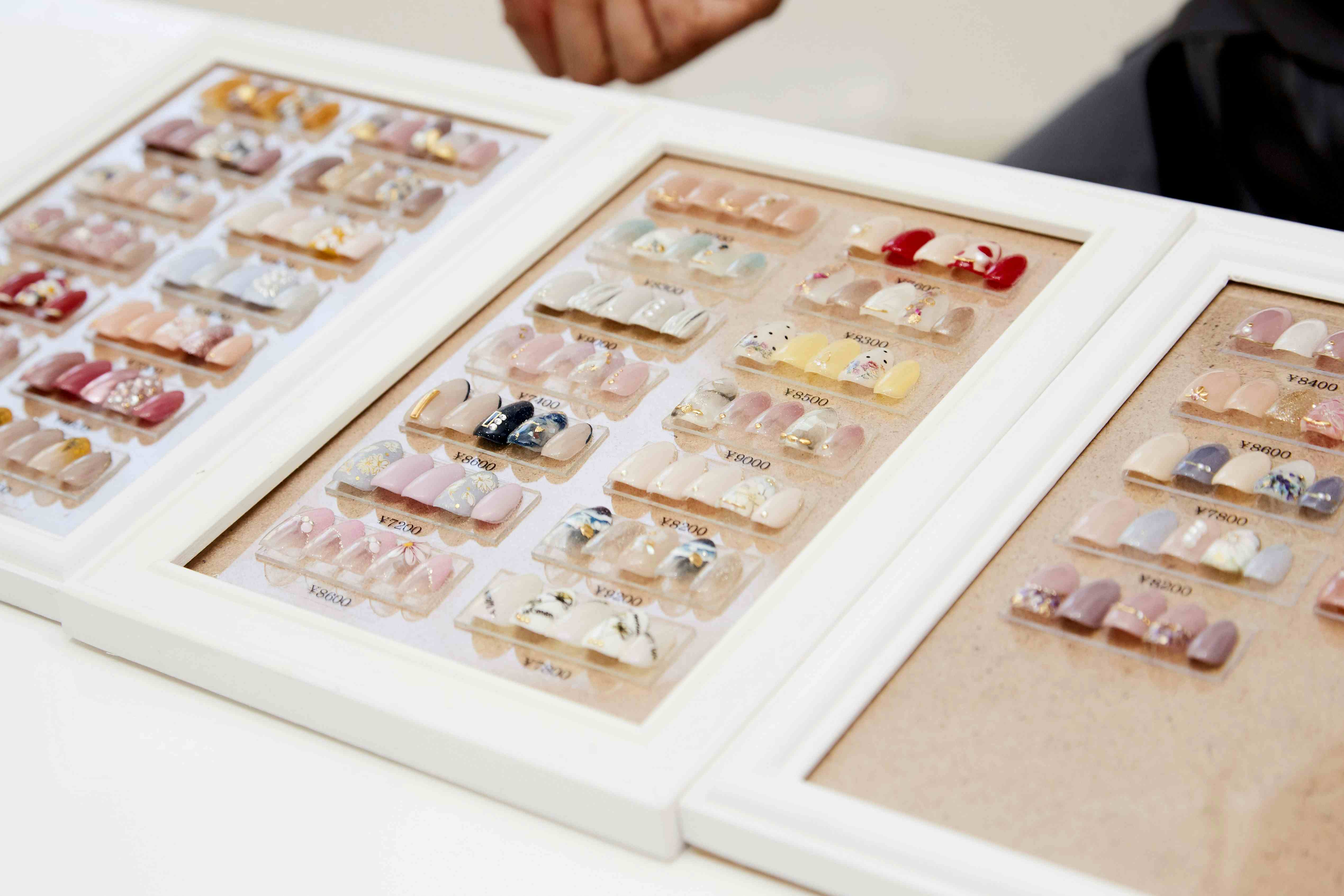 「サンプルを頻繁に変えるようにしています。15種類くらい入るケースにサンプルを入れて、3ヵ月ごとに1ケース入れ替えていることが特徴です。そこに追加で雪や桜といった季節のアートも作っていきます。一年中人気のデザインもありますが、チップが劣化するので使い回すことはしません。その場合は、必ず同じデザインを作り直すようにしています。さらに、サンプルのデザインは組み合わせが自由なので、ワンパターンにならずに毎回楽しく選んでいただけていると思いますね。