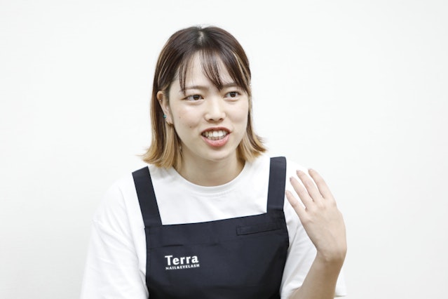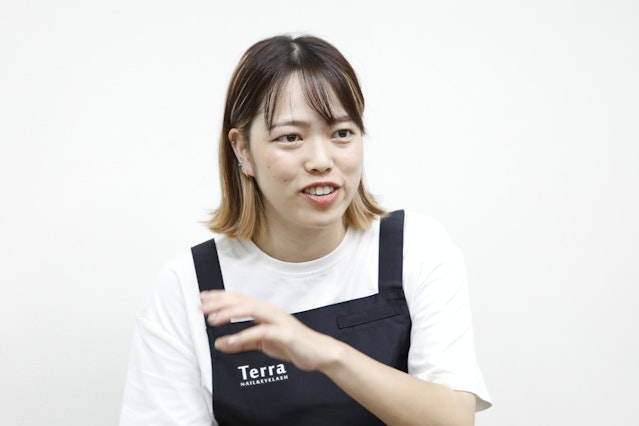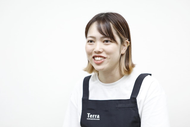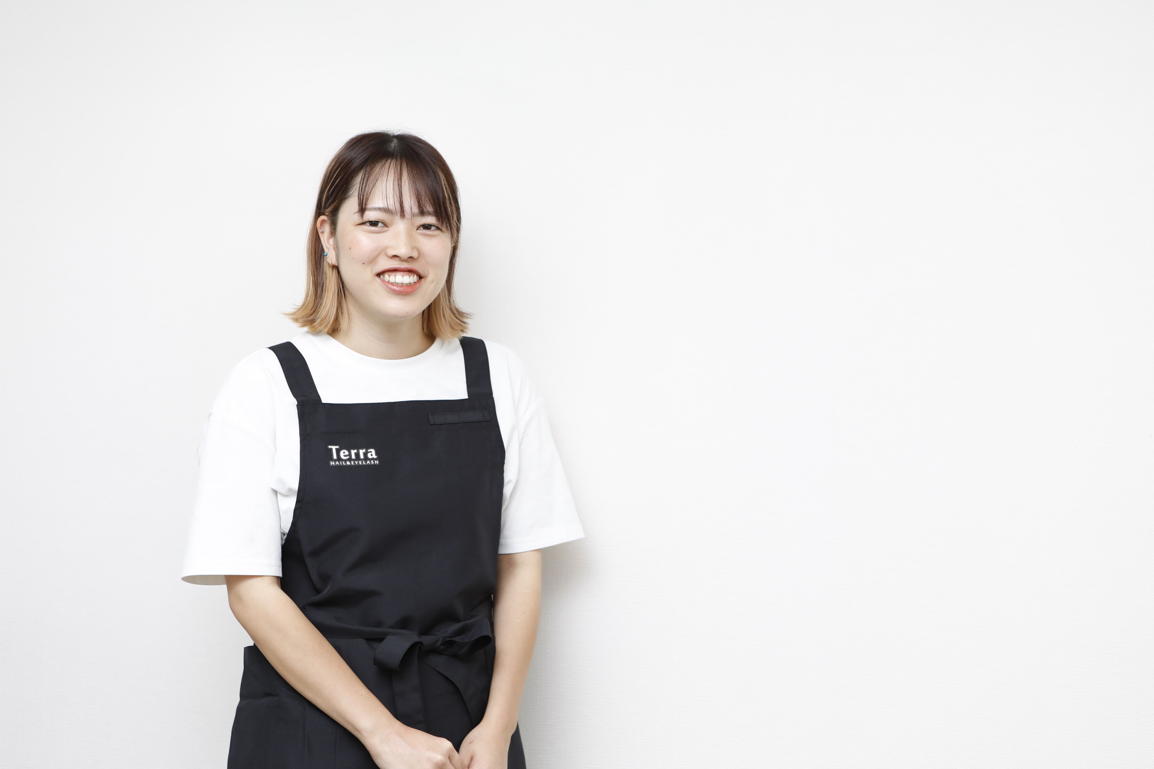 4年制の大学を卒業後、飲食店のアルバイトを開始。同時にネイルスクールに通い、技術を習得する。「Terra」入社後にはネイルのスキルを磨きながら、前職で培った接客の心掛けを意識し、人気ネイリストへ。入社2年半で渋谷店の店舗の役職と技術を教えるインストラクターを兼任している。