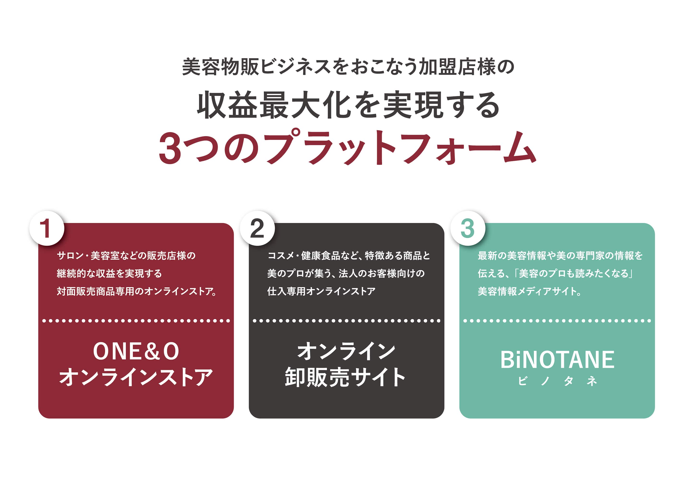 そんな『ONE&O』が、美容物販での収益最大化を実現するポイントは『オンライン卸販売サイト』、『ONE&Oオンライン』、『BiNOTANE』の3つのサービスの連携にあります。