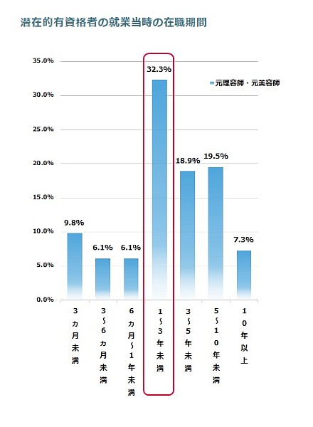 美容師は離職率が高い職業としても知られており、在職期間の短さは下記のグラフでわかります。