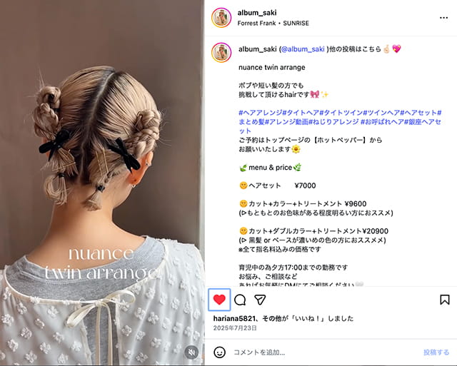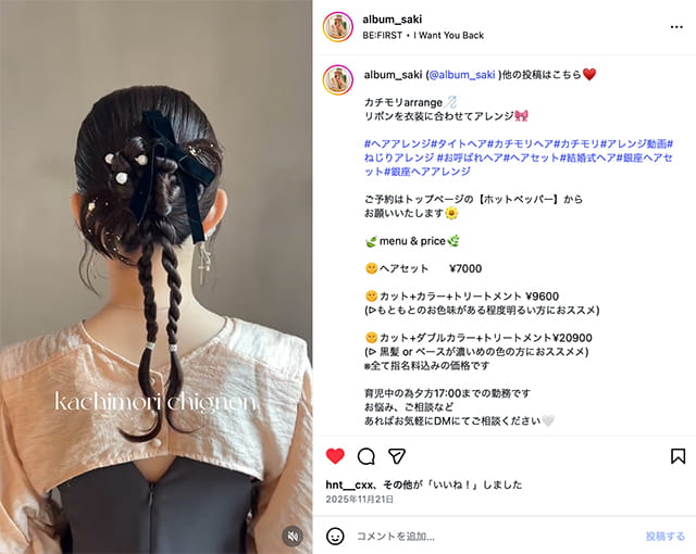 アレンジを入り口に来てくださった方に、接客や心遣いで「またお願いしたい」と思ってもらえたら、それが次につながります。続くかどうかは、SNSの力だけではなく、美容師としてのこれまで積み重ねてきた軸が大切だと思っています。