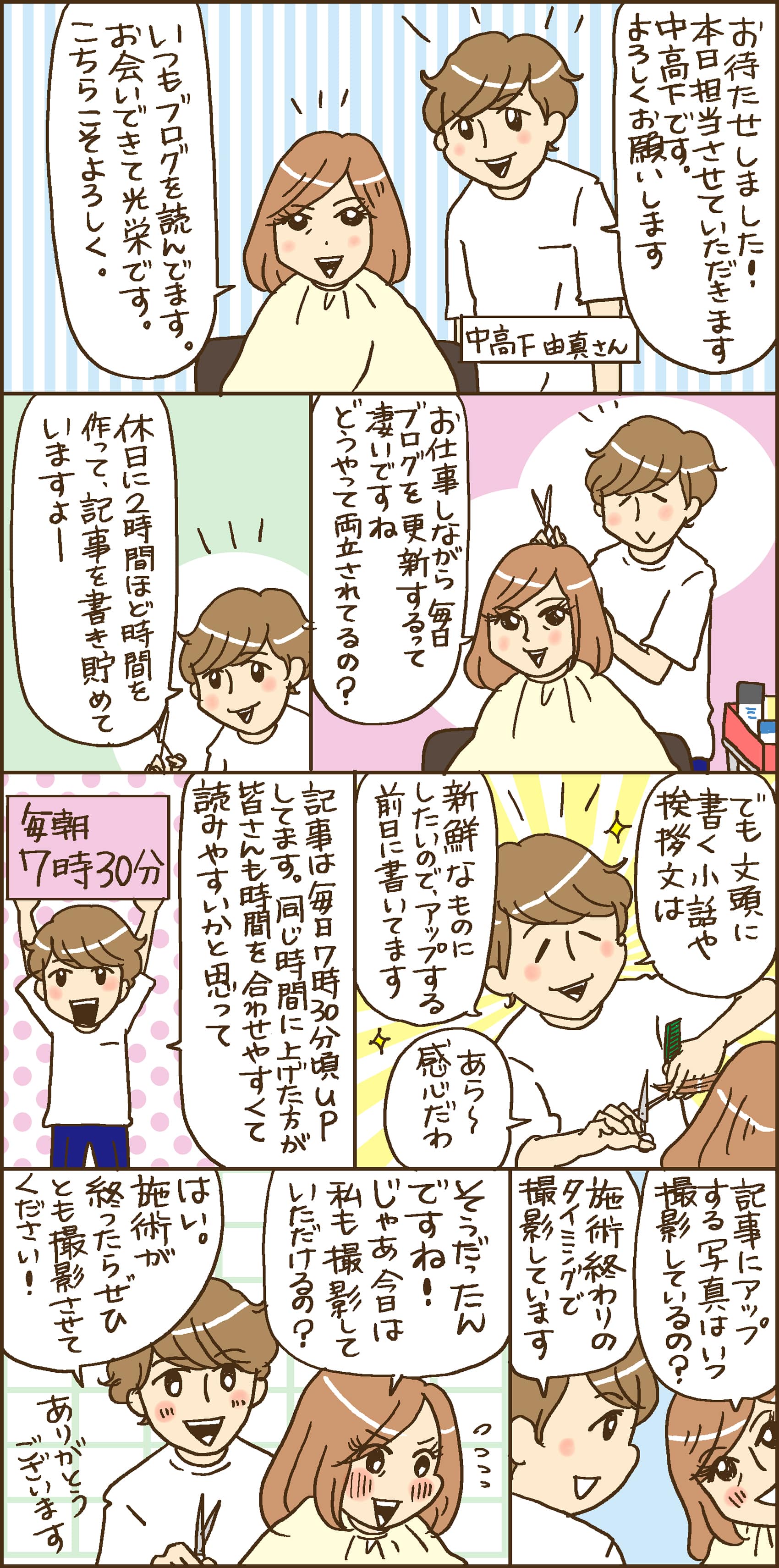 サロンワークとブログの毎日更新を両立するために、休日に記事を書き貯めていたのですね。記事の文頭に書く挨拶や小話は新鮮なものにするために、アップする前日に書いているとのことです。それから、読者の方にとっても読みやすくするために、記事は毎朝7時30分と時間を決めて更新されているんですね。