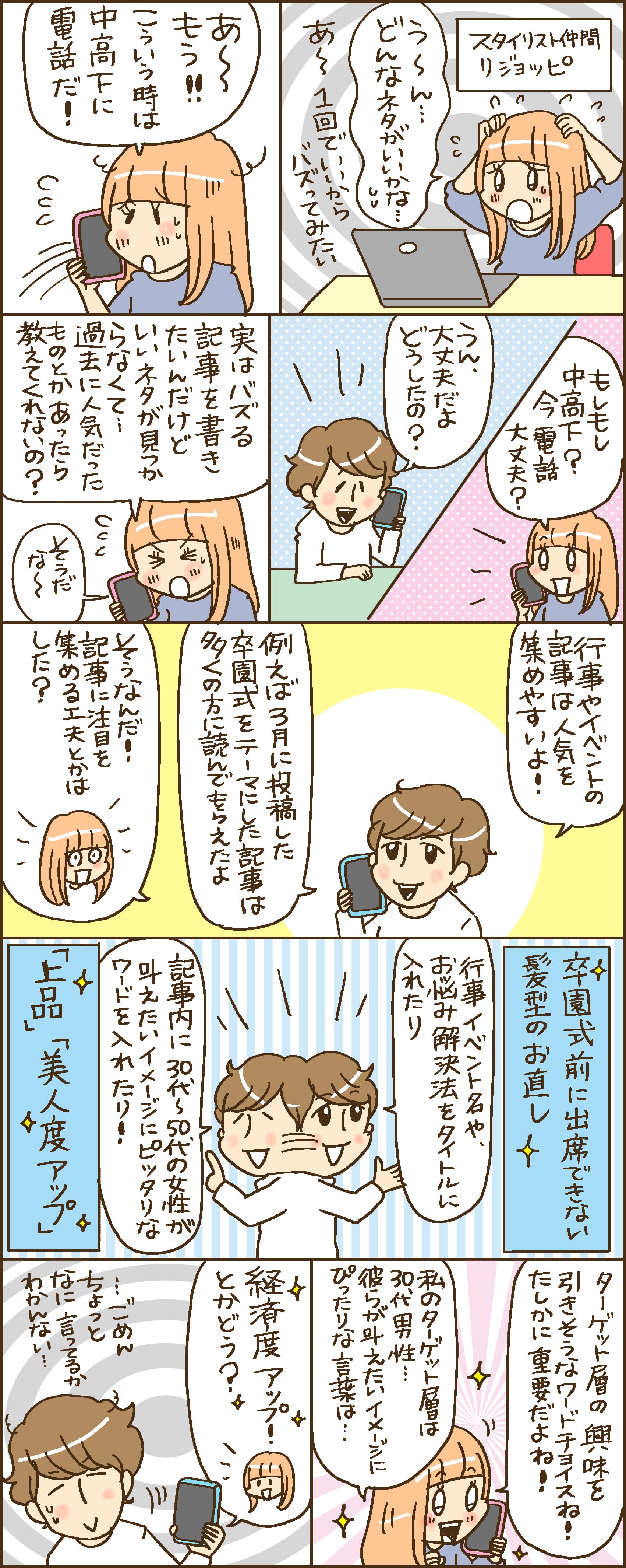 ターゲット層の方が控えている行事やイベントに沿った記事は、人気を集めやすいとのことです。行事・イベント名を記事のタイトル文に入れると、一目で内容がわかり、さらに注目を集めることができるんですね。ターゲット層の方が叶えたいイメージに合いそうなワードを選ぶことも、注目度を上げるためのコツのひとつというお話をお聞きでき、大変光栄でした。