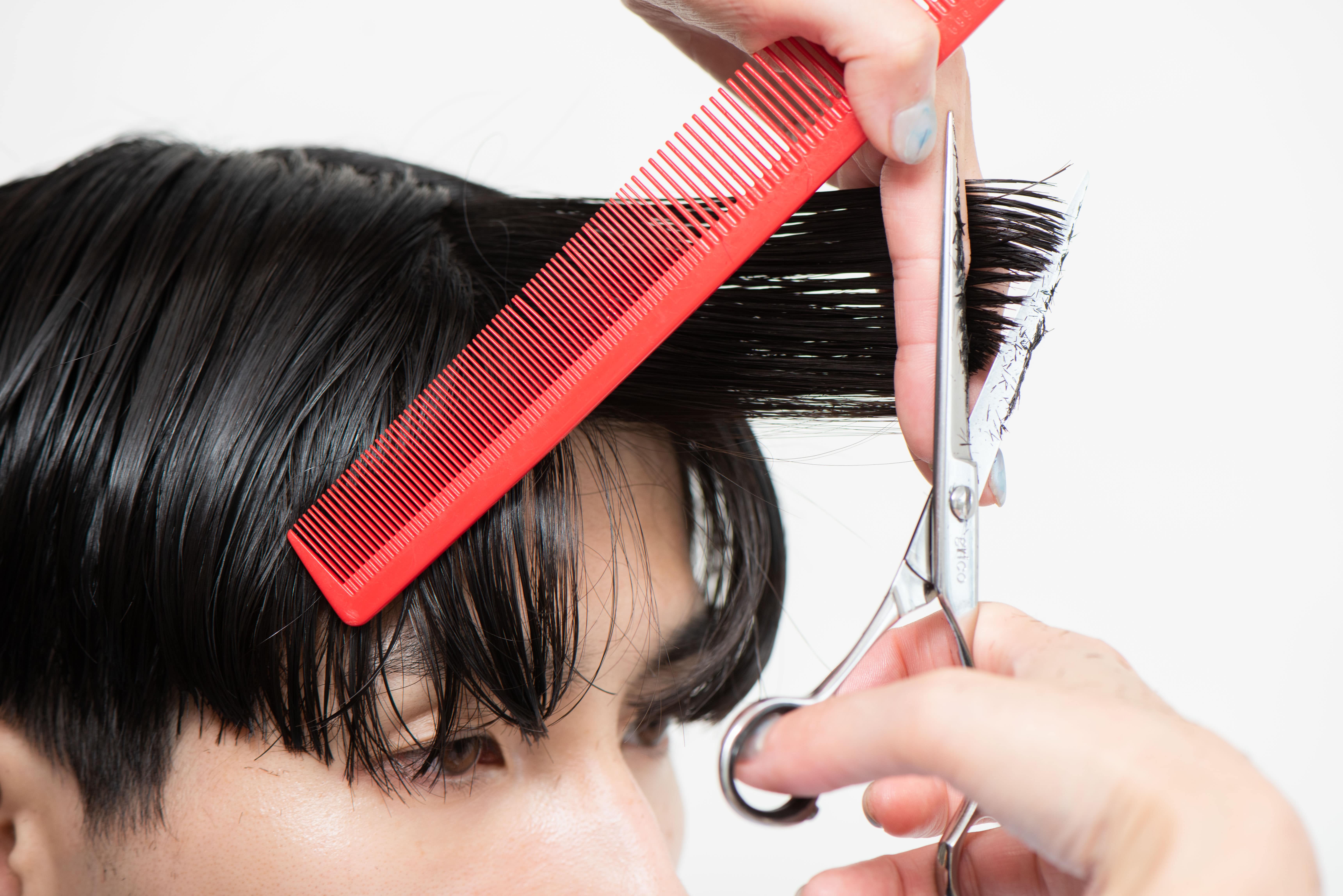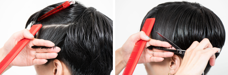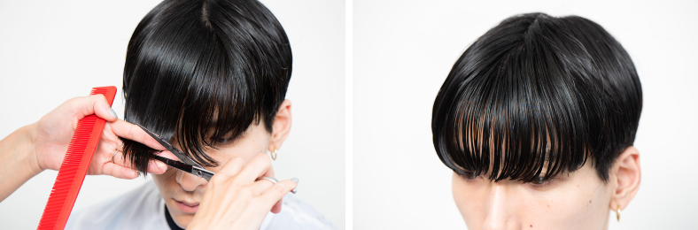 前髪は真ん中で平行に引き出してカットすると、グラデがつけやすい。