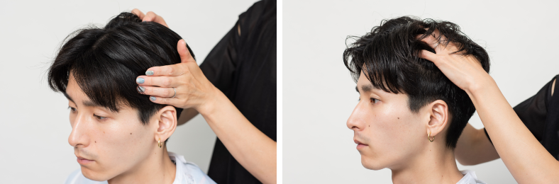センターパートは前下がりにしがちだが、そうするとスタイルがワンパターンになってしまう。ややラウンド気味にカットすることで、自分でスタイリングした時もいろんなバランスに調整しやすい。