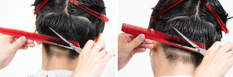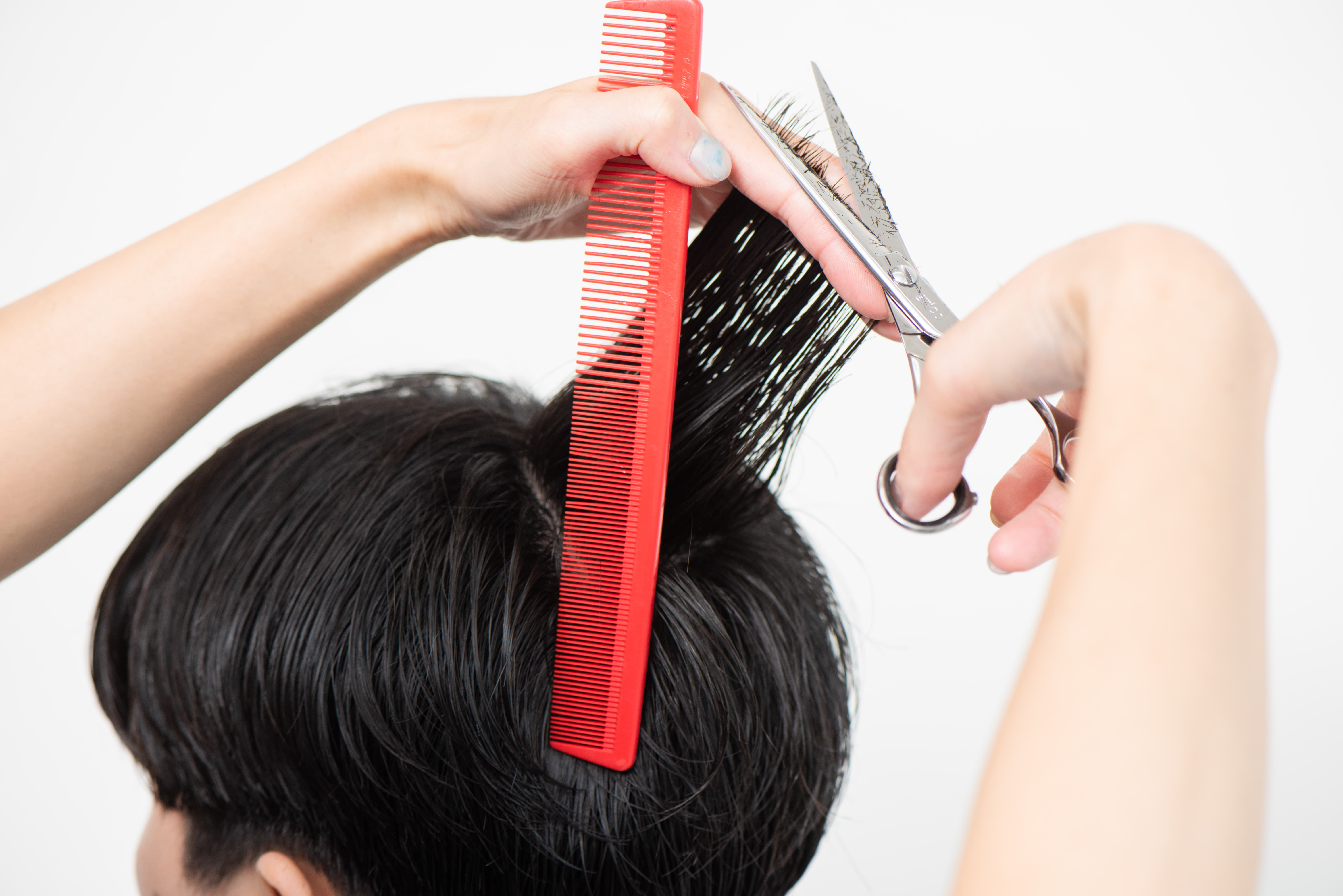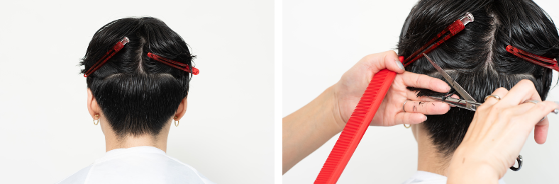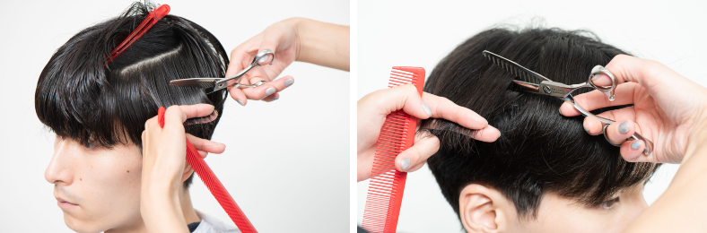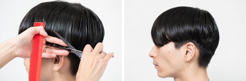 後ろを刈り上げる際、平面的にならないよう、吹き上げるようにカットしていくのがコツ。シンプルなスタイルにも、ぐっと奥行きが生まれる。