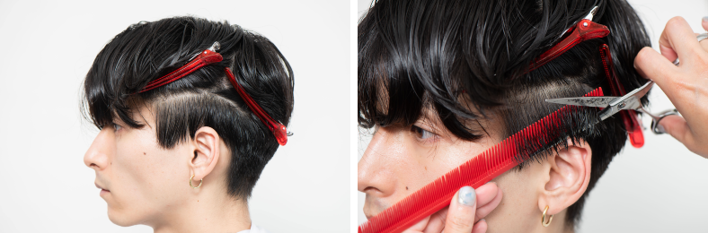 サイドはこめかみより少し下でブロッキングし、ヘムラインを短くカット。なじませるように刈り上げにしていく。