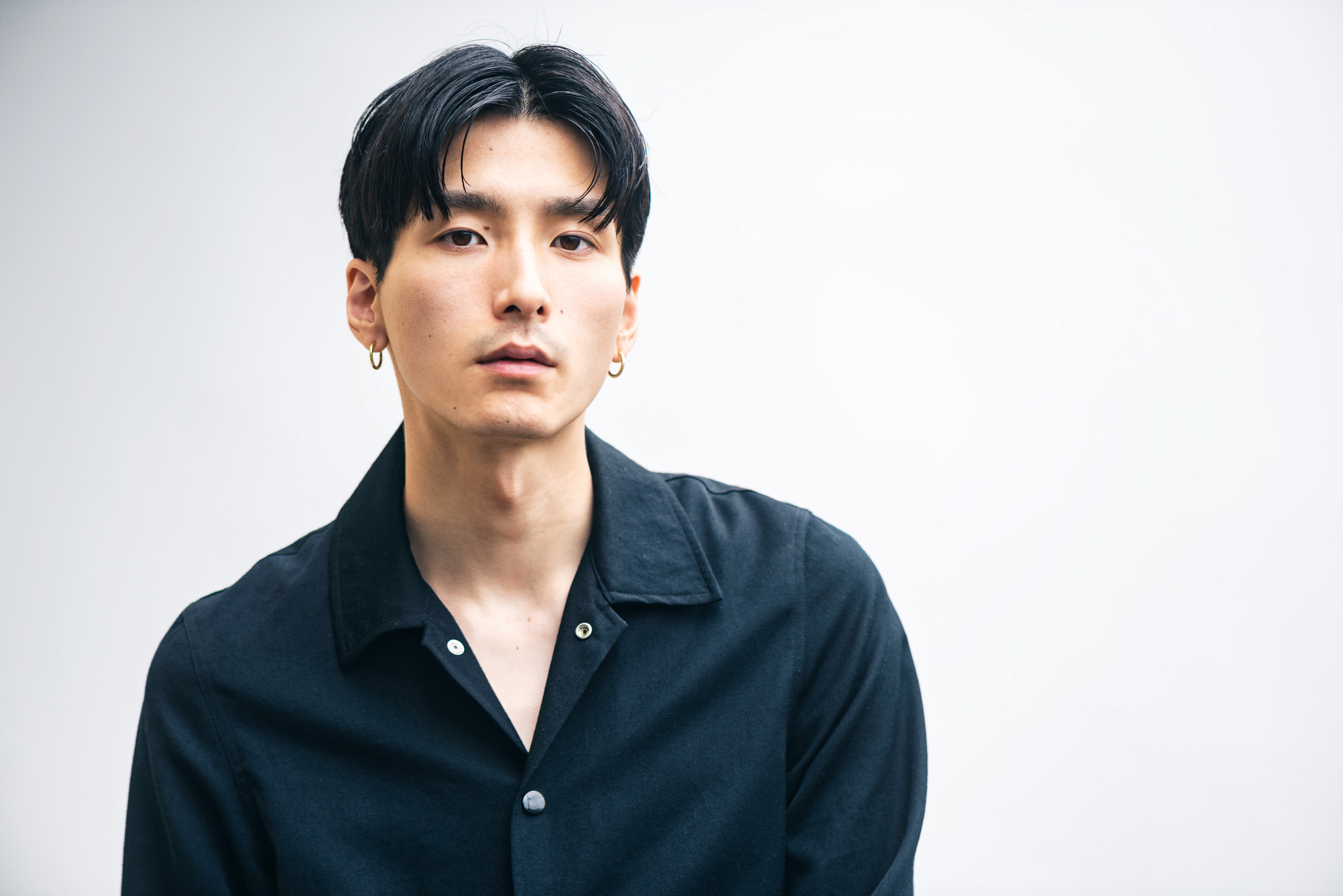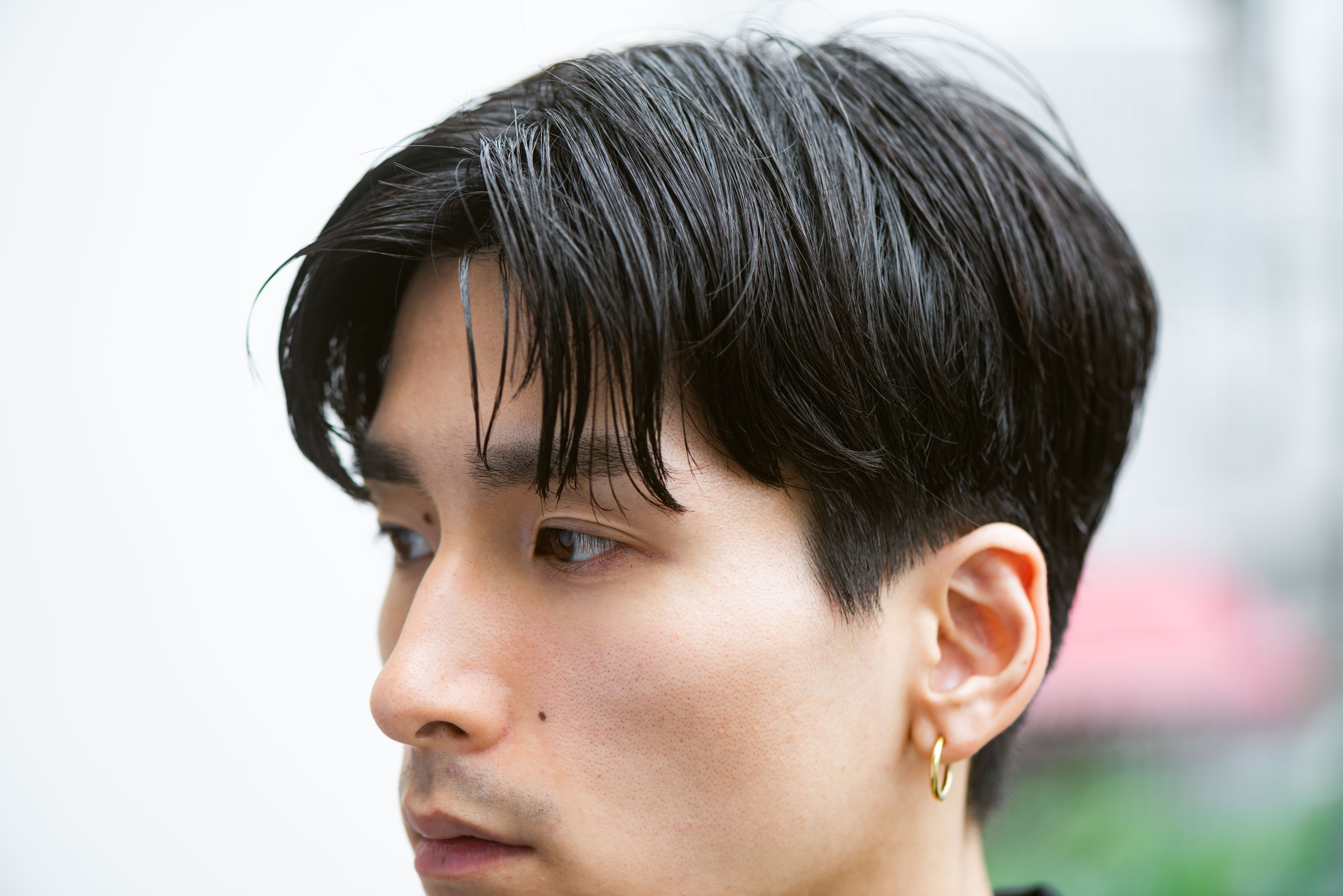 短めのセンターパートでスッキリ見せながら、サラリと軽いウェット感でお洒落な雰囲気も漂わせて。