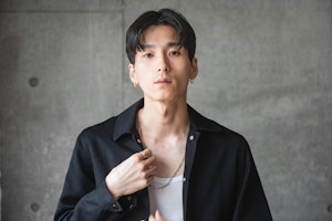 センターパートにする際は、ドライの時点で真ん中で分けながら乾かしておくとスタイリングが簡単に。今回はワックスを2種類使用。始めにベースとしてオイルワックスを薄くなじませる。次に、もう少しホールド感の出るジェルワックスを内側から全体になじませて動きを出しやすくする。