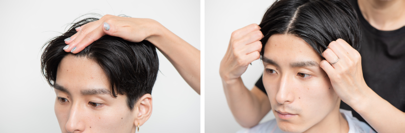 前髪の根元にもワックスをオン。ペタッと軽く押しつけるようにし、両サイドへ髪を下ろす。