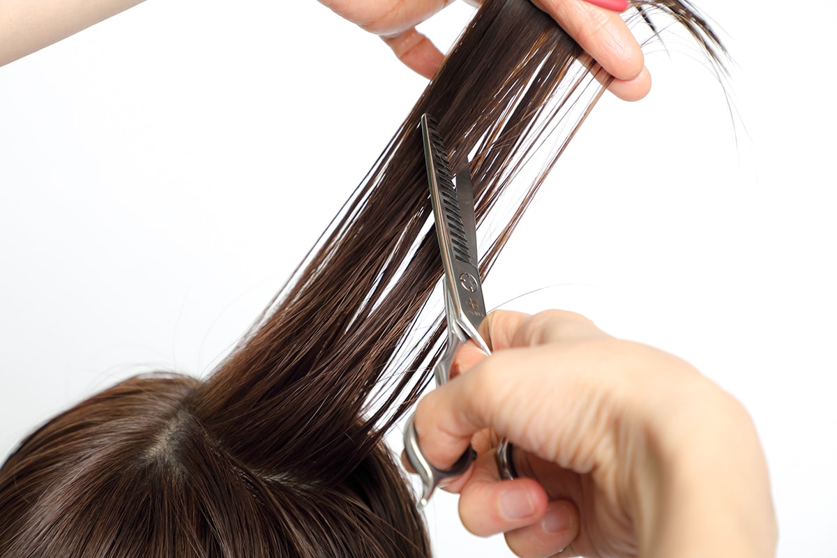 髪表面はすきすぎないのが鉄則。刃先を表面に出さないようにしてすいていくと、毛先がぴょんぴょん出ずになじみ良く仕上がる。