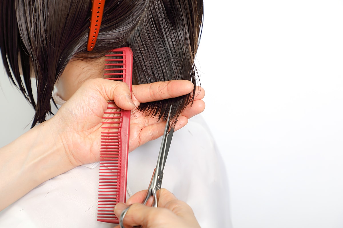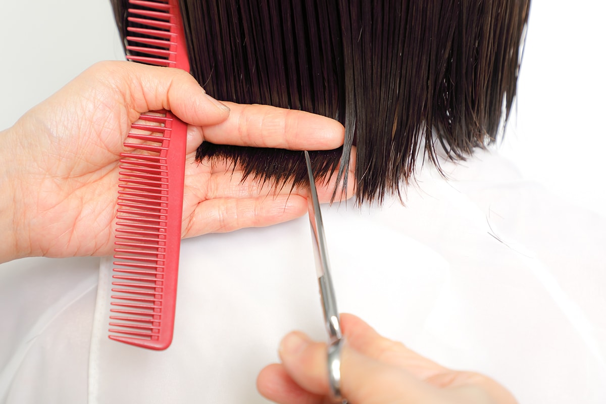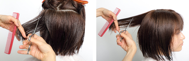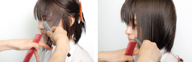 ブロッキングを外し、全体の長さを合わせる。今回のモデルさんはサイドが少し持ち上がり気味なので、やや前下がりのカットラインに。