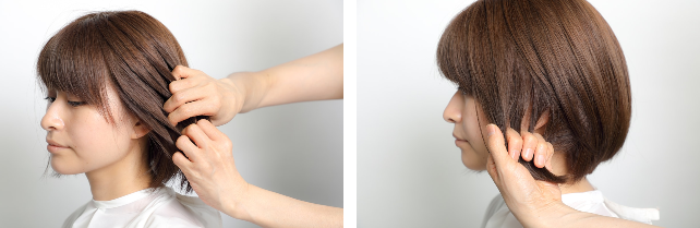 サイドは、横から後ろへ流れるように。顔周りはフェイスラインに沿わせながらつける。