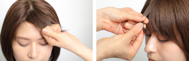 前髪は中間から毛先になじませ、毛先はつまみながら束感を出す。