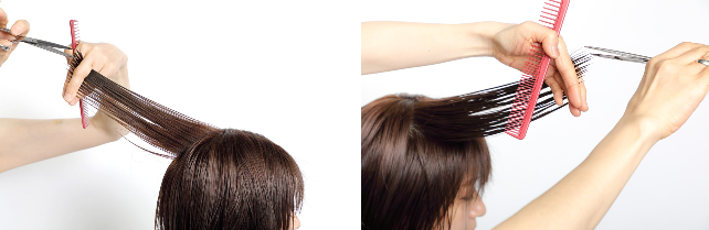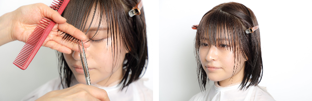 今回、前髪は1cmくらいカット。サイドへかけてつながるように、ラウンド気味に仕上げる。