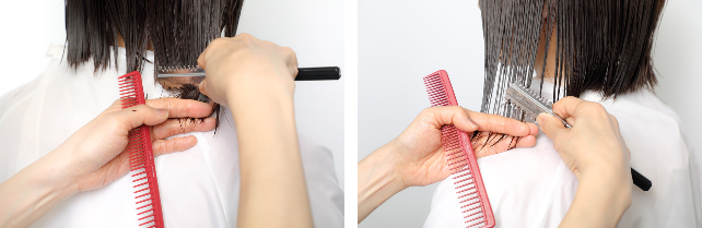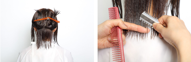 セニングを入れていく。耳後ろは根元から、中央は中間くらいから毛量を取る。