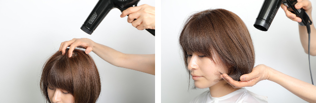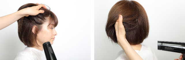 表面は上から風を送り、トップをさすりながら分け目がつかないように乾かしていく。毛先は手で持ち上げるようにドライすると、この時点から丸み感が出る。