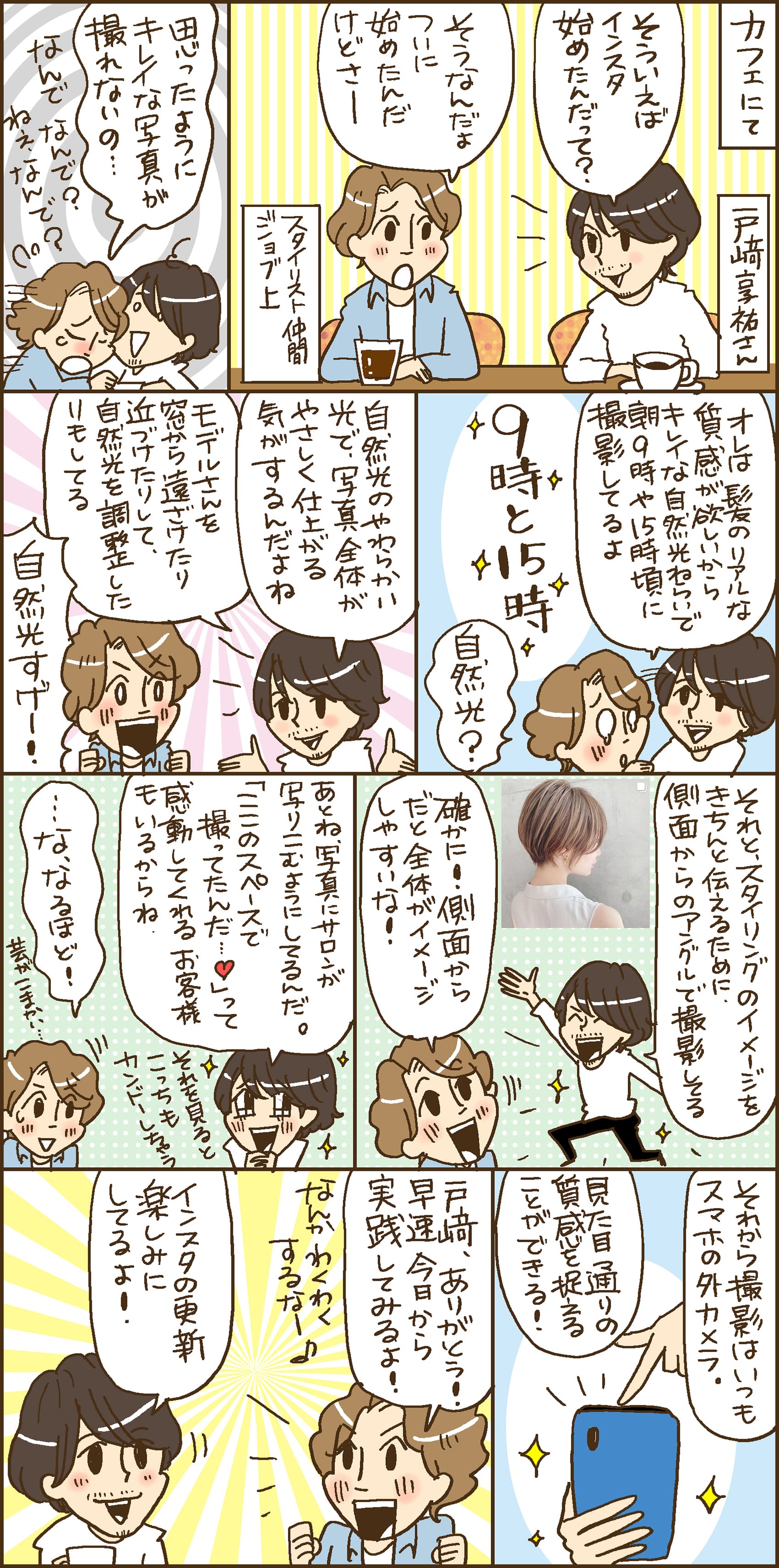 戸﨑さんは、髪のリアルな質感を撮るために、9時と15時に射す自然光を取り入れて撮影されているんですね。髪の良さをしっかりとお客様に届けるために、側面からのアングルで撮ることも重要だと伺いました。さらに、来店されたお客様に感動していただくために、サロン屋内の一部が映りこむアングルで撮っているとのことです。