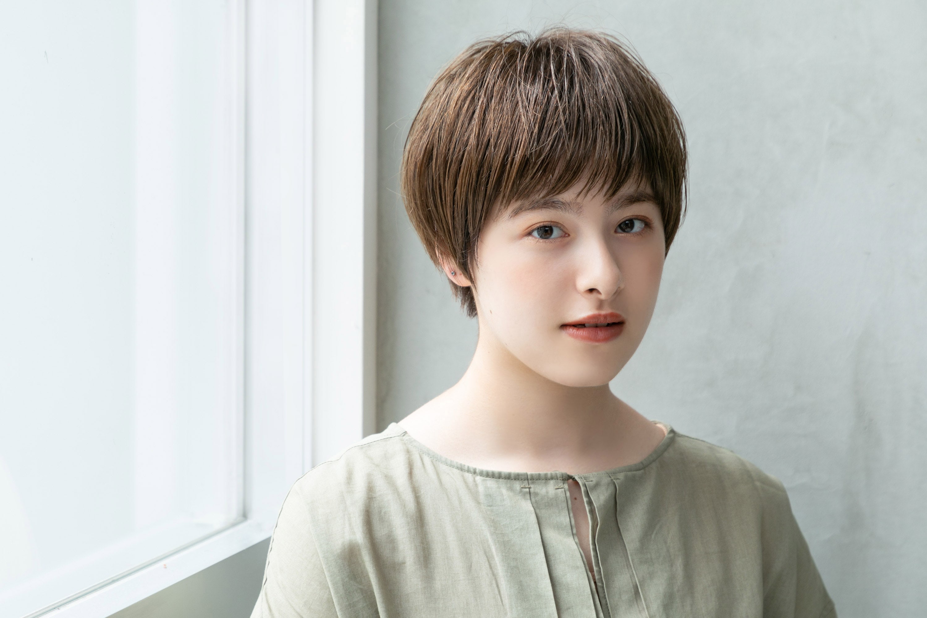 カット前は全体的に角が残るボーイッシュな質感。骨格診断により頭の形や生えグセなどを考慮しながら、丸みを作って女性らしい柔らかさのあるマッシュショートに。さらに求心的で幼な顔に見られがちな印象を、大人っぽい雰囲気へシフトさせた。