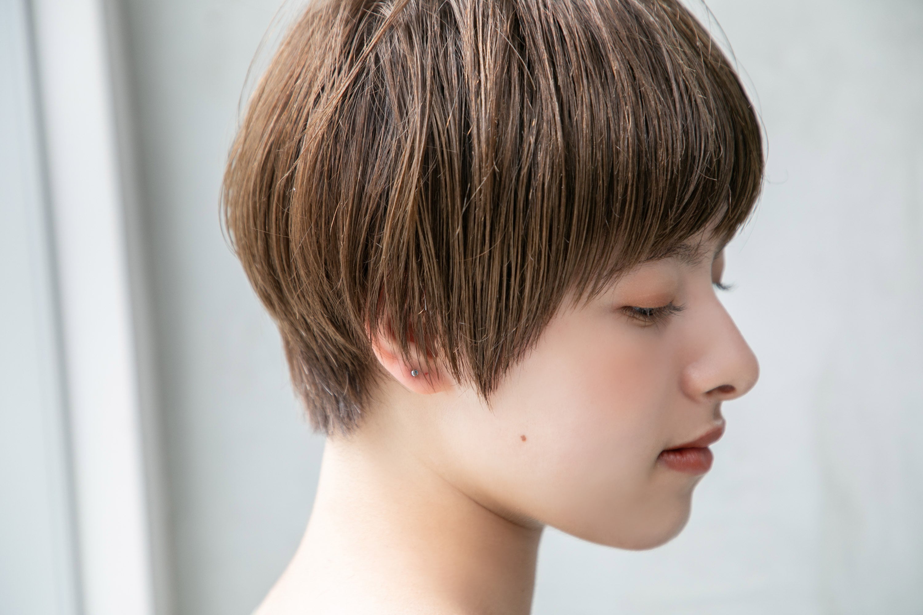 カット前は全体的に角が残るボーイッシュな質感。骨格診断により頭の形や生えグセなどを考慮しながら、丸みを作って女性らしい柔らかさのあるマッシュショートに。さらに求心的で幼な顔に見られがちな印象を、大人っぽい雰囲気へシフトさせた。