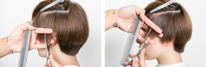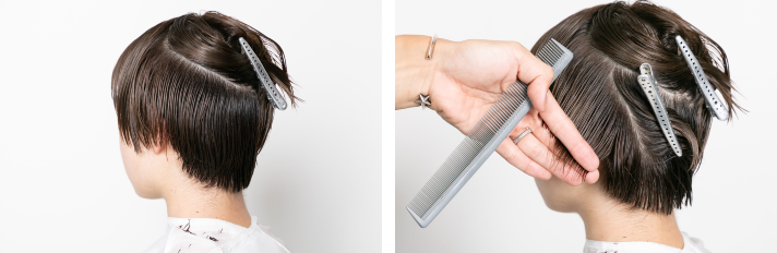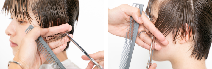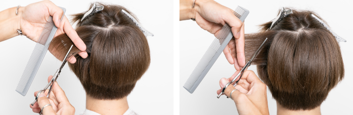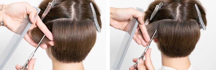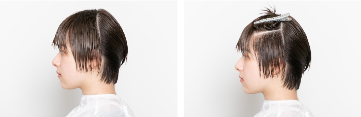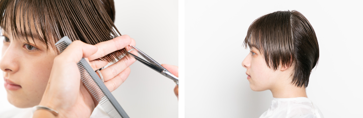 ブロッキングを外し、動きやすい部分を柔らかくコーミングしてから、指1本分リフトしてカット。切り上がり(右)を見ると、カットラインがなじみやすくなった。