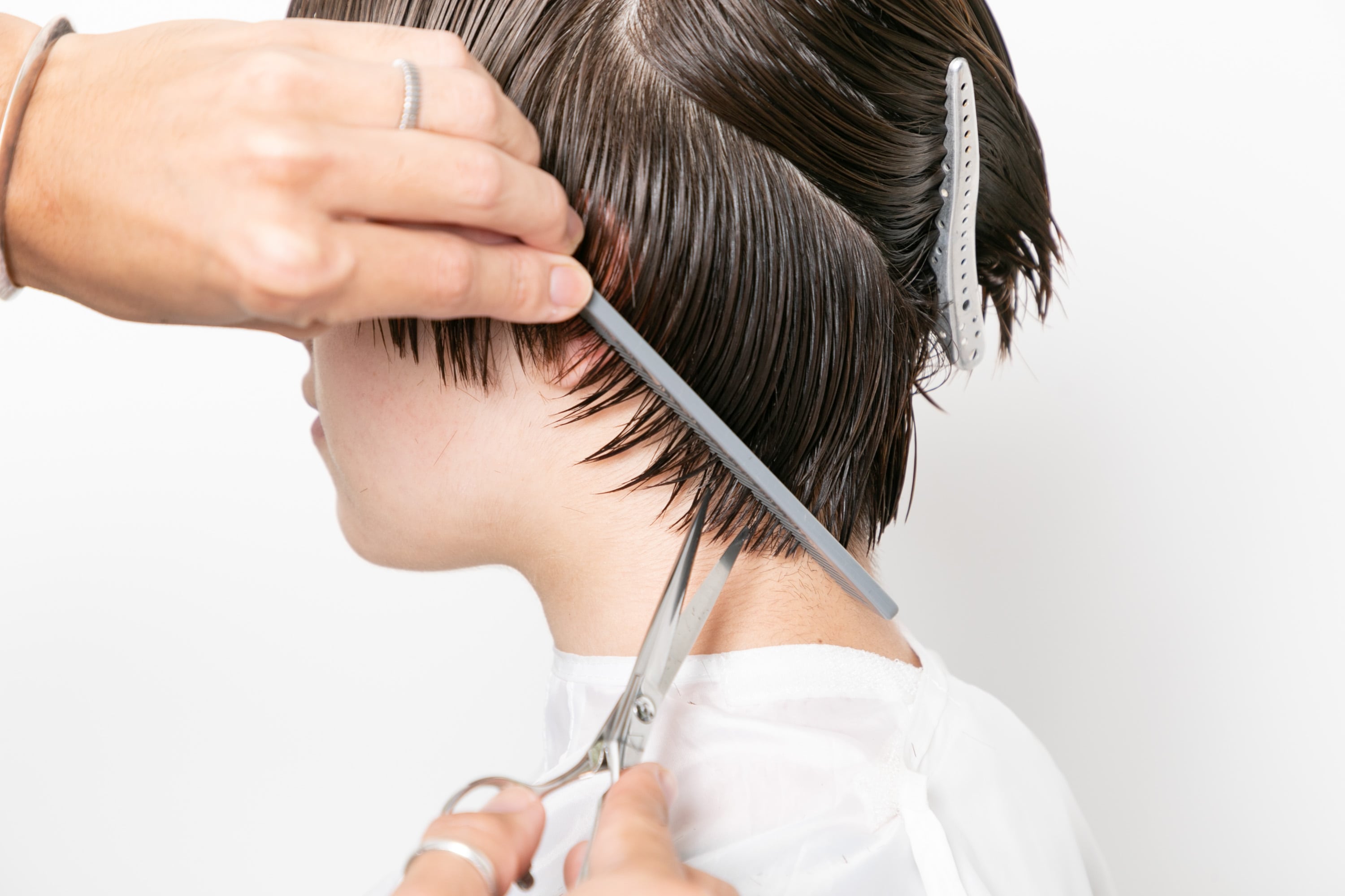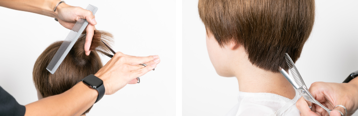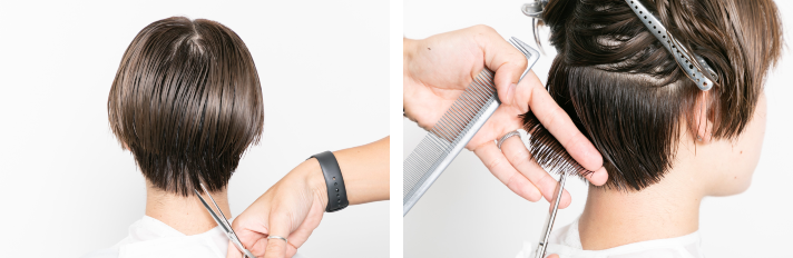 襟足は落ちる位置で、ノンテンションでカット。ぼんのくぼから下に締まりが欲しいので、グラデーションでつないでいく。