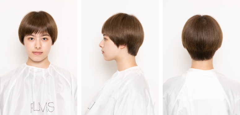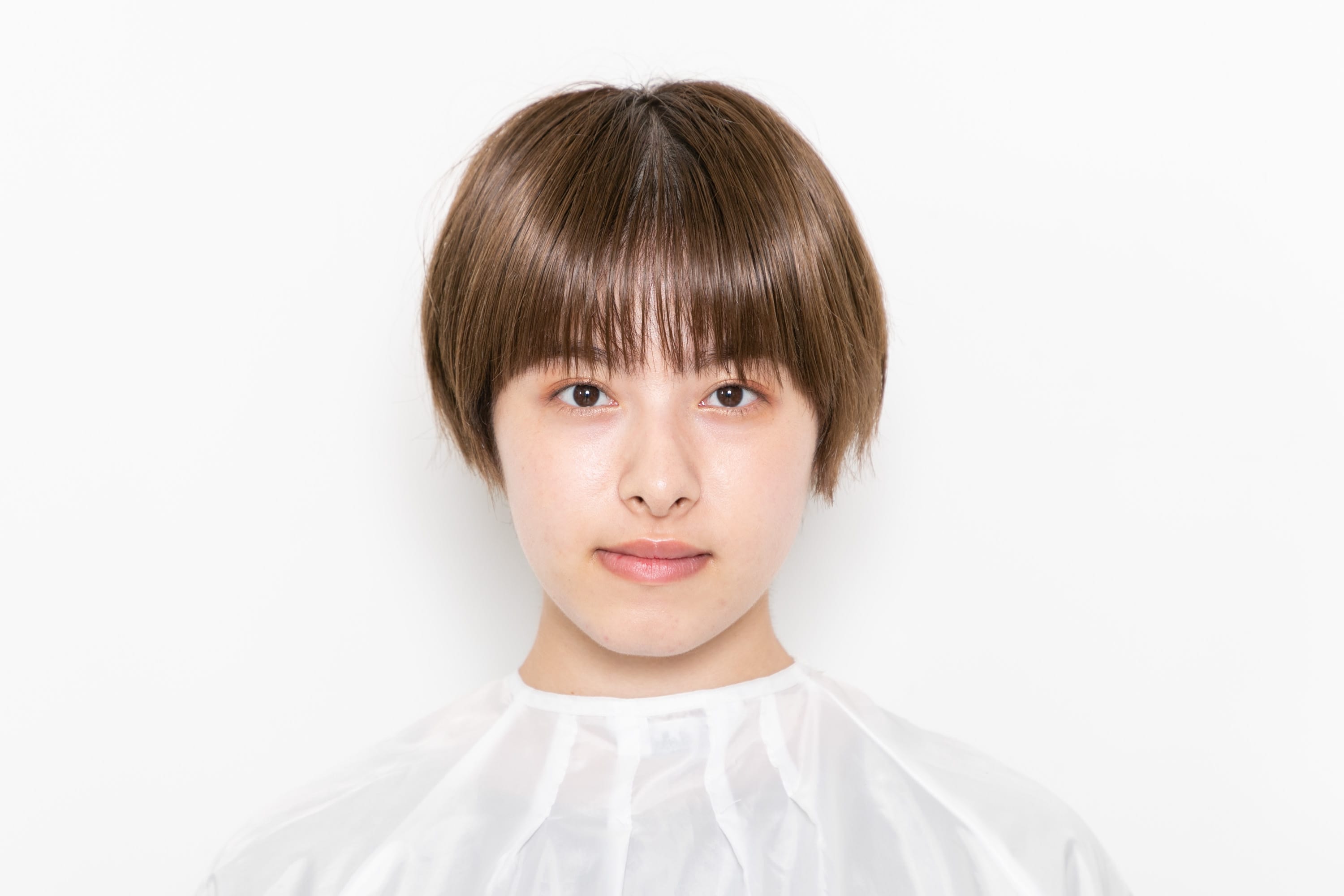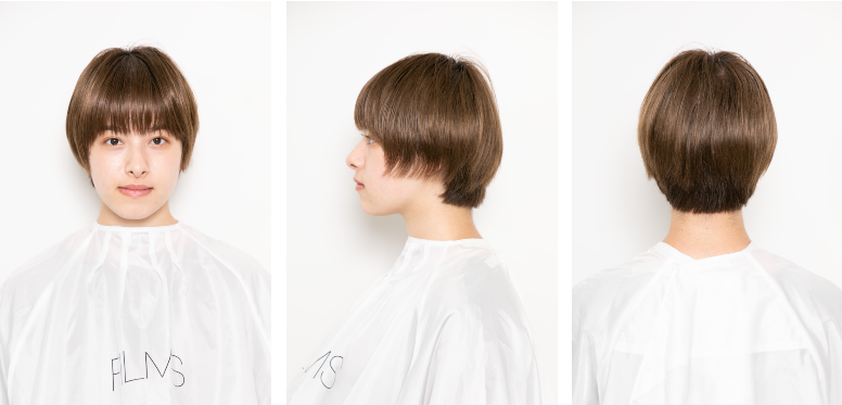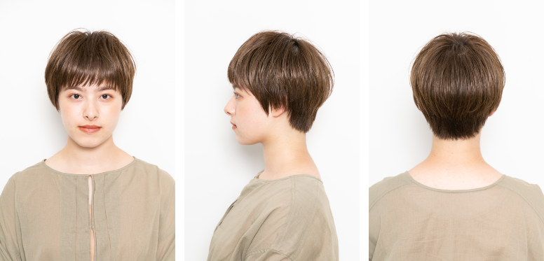 襟足とサイドをすっきりさせ、角が残っていた部分は丸みを作ってなじみ良く仕上げた。前髪はオン眉にカットし、肌が見える面積を少しだけ広めに。質感、印象ともにボーイッシュだったカット前から、大人っぽい女性らしい雰囲気にチェンジ。
