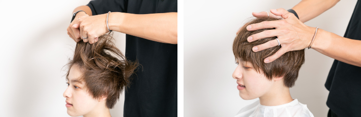 ショートの場合、スタイリング剤が均一についていないとムラが出やすいので、全体にしっかりなじませるのがポイント。