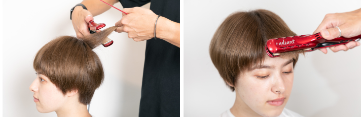 ストレートアイロンを根元付近から毛先にかけて通し、少し丸みを出す。表面のみ一周ぐるっとかけ、前髪も同じようにする。
