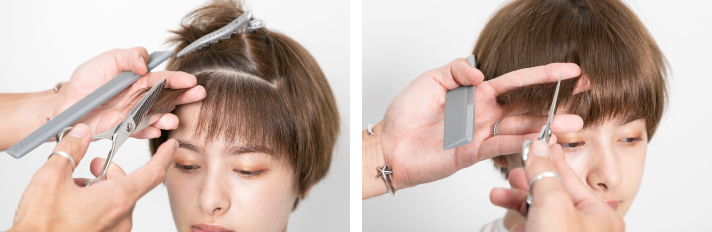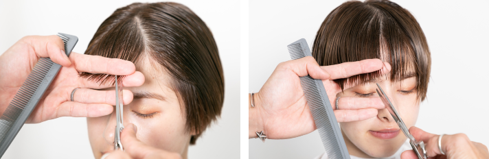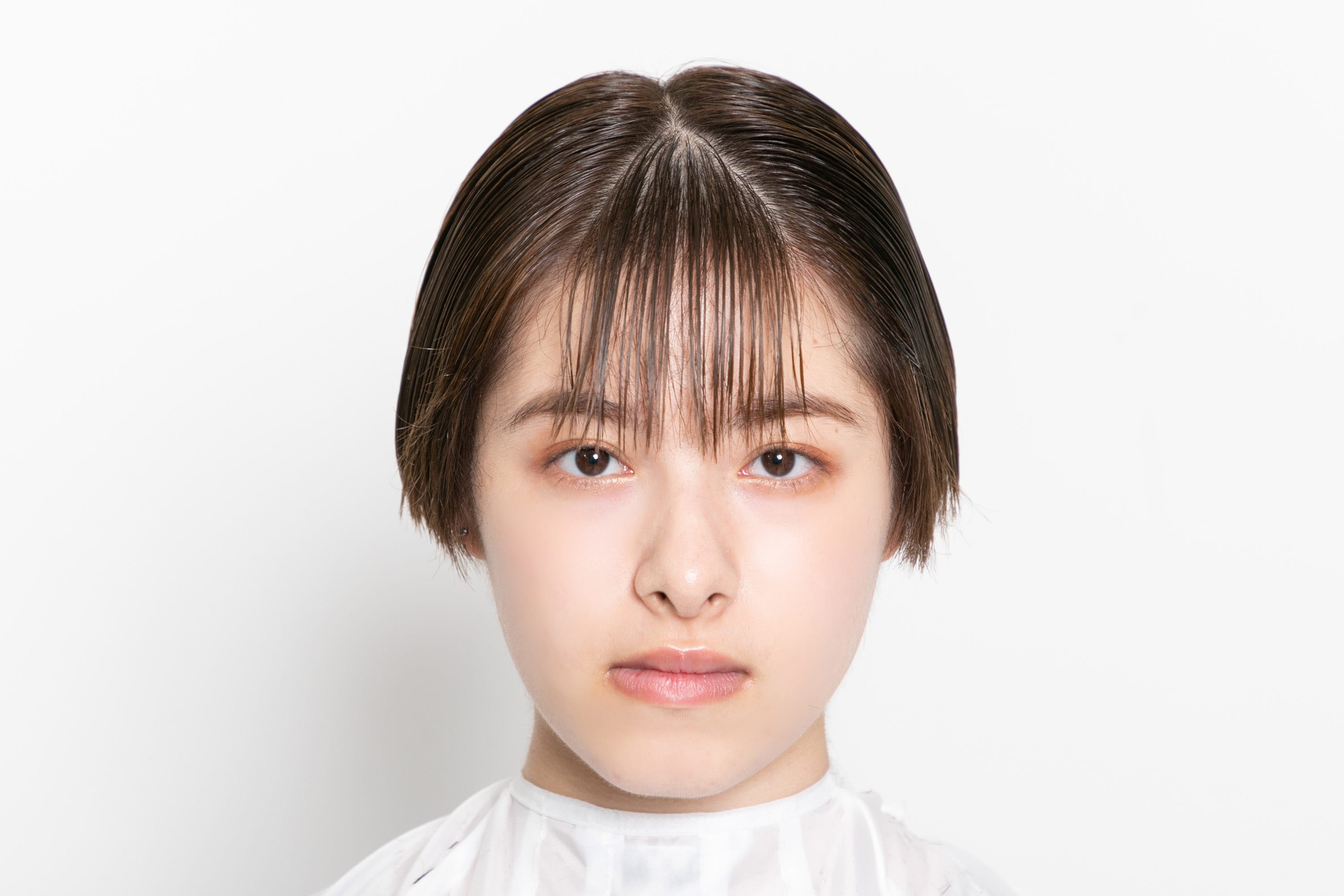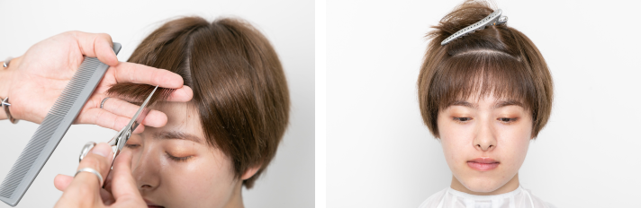 眉より少し上まで長さをカット。前髪のエンドラインとサイドの髪をつなげる。この時点ではベースだけ作っておき、ドライ後にまた調整する。