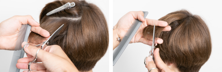後頭部の丸みを出したい部分を、斜めにスライスを取る。その斜めスライスに対し、やや縦寄りのスライスをさらに取って、前にダイレクションをかけながらカット。これでなじみが良くなるのと、前上がりのグラデーションがつけられる。