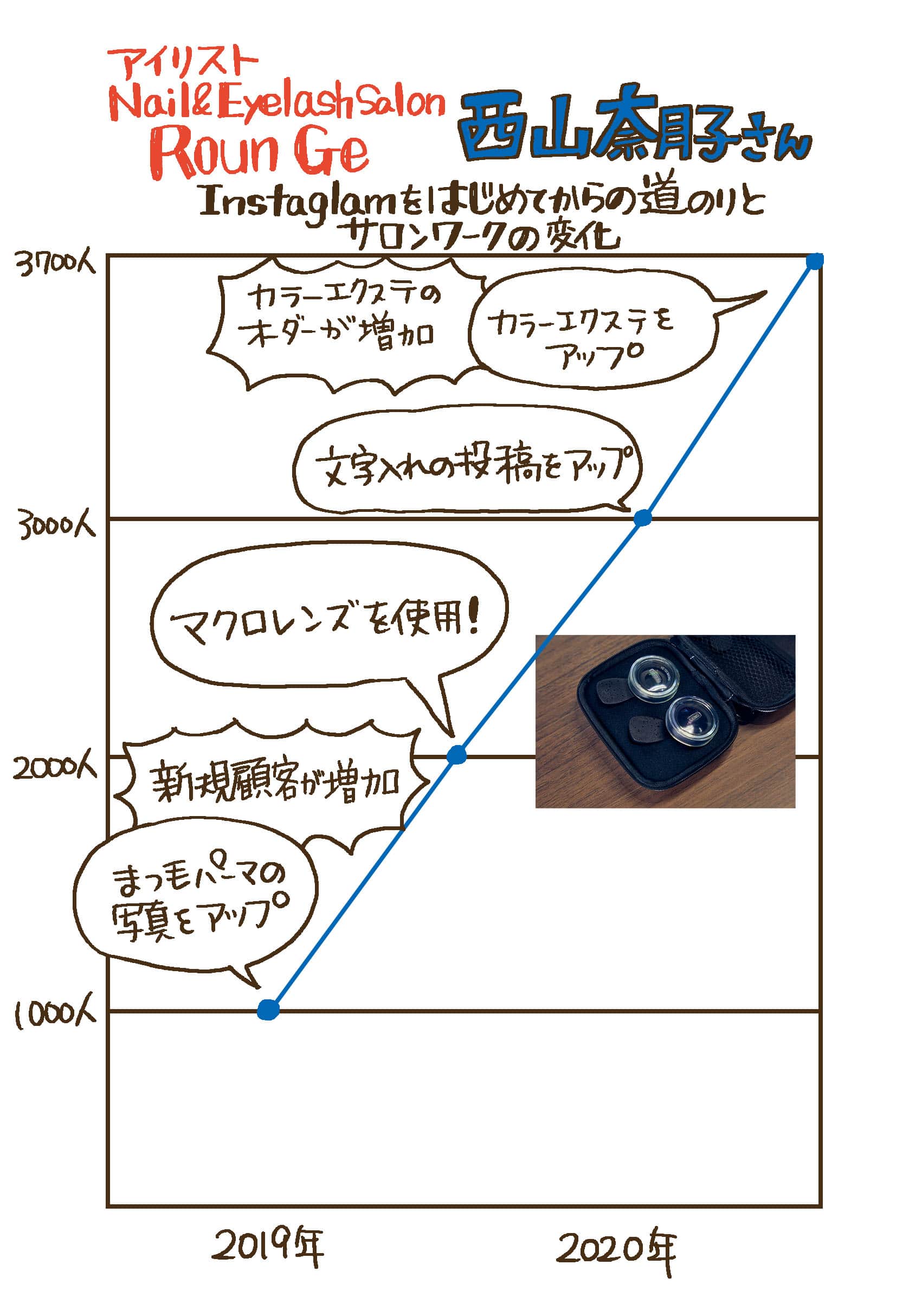 3700人以上のフォロワーを抱えている人気のアイリスト、Nail & Eyelash Salon RounGe・西山奈月子さん。フォロワー数に加え、高いエンゲージメントと売り上げアップを達成した背景に3のことを意識していたとのこと。今回はそんな西山さんが現在の人気を得るために、Instagramにどんな試行錯誤を行ってきたのかを伺いました。