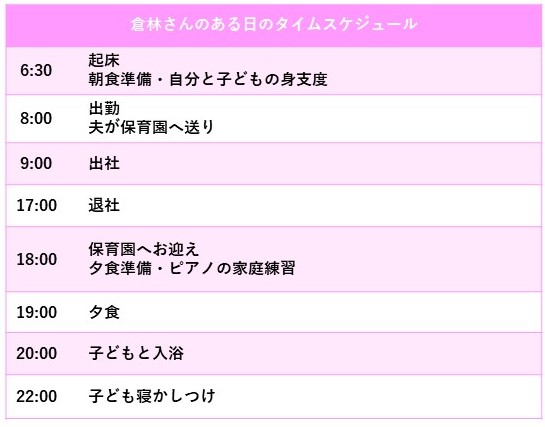 「ふだんは、ひと回り以上年上の夫がいちばん手伝ってくれています。夫は、基本的に帰宅が遅いのですが、わたしが出張や研修などで帰宅が遅くなる日は、都合をつけて早く帰ってきてくれます。子どもの保育園やおけいこなどの送り迎え、お風呂掃除、掃除機もかけてくれます。毎週金曜日は、『パパカレーの日』と決めて、夕飯にカレーを作ってくれるんですよ」