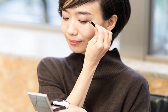 「仕事中の登場回数が多いのは、DHC PAディープコントロールアイシャドウです。いま、つけているのは、DC03ボルドーブラウン。研修では人前でお話することが多いので、きちんとした印象になるように心がけています。でも、強いイメージになりすぎると研修生が委縮してしまうので、少し優しさを醸し出すために、このアイシャドウで女性らしく仕上げます」