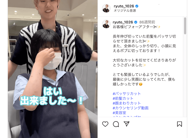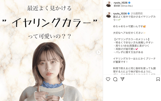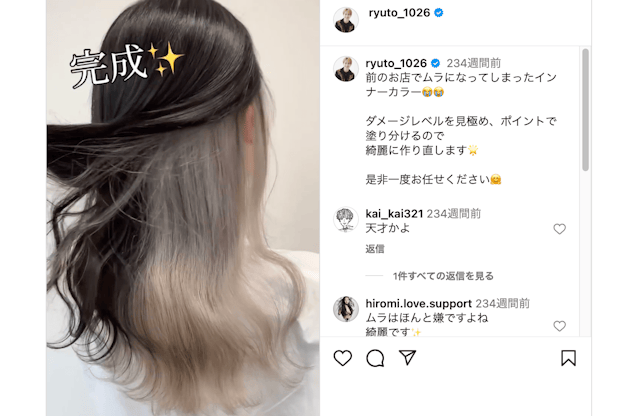 そもそも、動画で伝えたいのは「カウンセリング力」だったのでお客様のご要望を伺い、踏まえたうえで提案させていただく…という場面のみで、仕上がりは載せてなかったんですね。まさに、インナーカラーのビフォー・アフター動画とは全く違うものです。でも、フォロワーの方から「仕上がりまで見たい」というコメントを多くいただいて。カウンセリングに仕上がりを加えて投稿したところ、とても大きな反響をいただくようになりました。