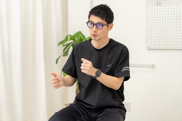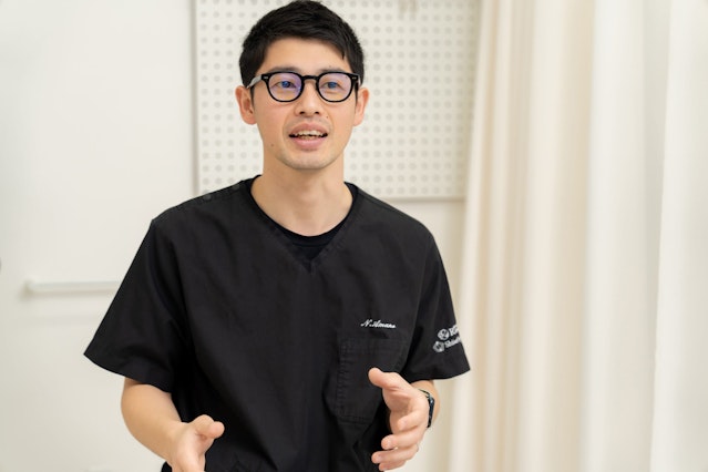 圧倒的な知識量と、痛みの原因を徹底的に探るアプローチに触れ、「自分はまだまだだ」と強い衝撃を受けたという天野さん。その後、アルバイトを経て「Roots」へ転職し、これまでの理学療法士の経験も生かしながら、日々お客様と向き合っています。