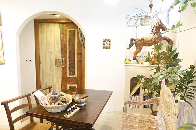私がスリランカで訪れたアーユルヴェーダの建物の前には小さな中庭が作られていて、初対面の人同士でも気軽に会話をして打ち解けていました。それを見た時に『こんなスペースを作りたいな』と。実際にサロンではワークショップなどを開催したことがあり、お客さま同士がつながる憩いの場になっています」