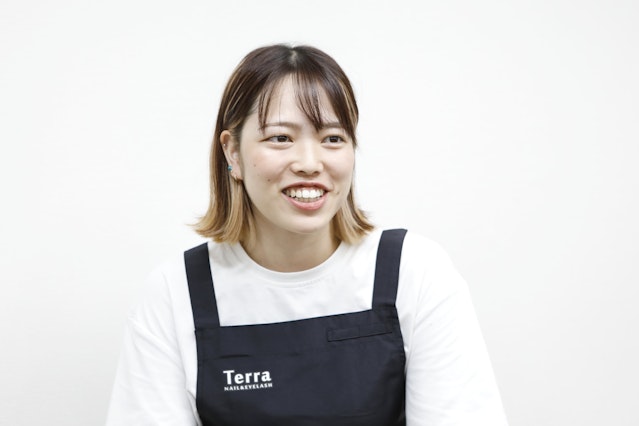 4年制大学を卒業後、飲食店のアルバイトを開始。同時にネイルスクールに通い、技術を習得する。「Terra」入社後にはネイルのスキルを磨きながら、前職で培った接客の心掛けを意識し、人気ネイリストへ。入社2年半で渋谷店のリーダーと技術を教えるインストラクターを兼任している。