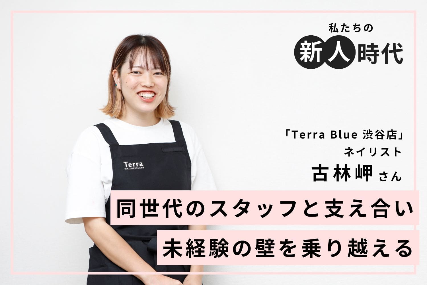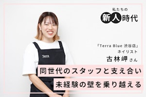14,000点以上のアートサンプルをiPadで管理し、どんなデザインも叶えられると話題のネイル&アイサロン「Terra」。そんな人気サロンの東京・渋谷店で未経験から入社し、お客様からの支持を集めるのが古林岬さんです。
