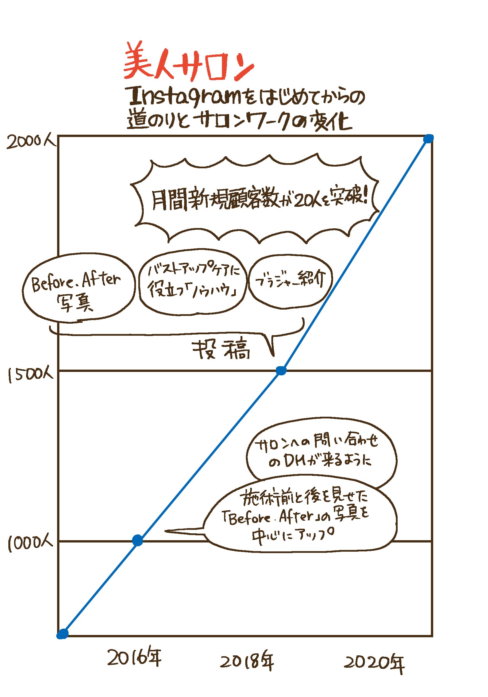 「Before・After」、バストアップケアに役立つ「ノウハウ」、スタッフの人柄が分かる投稿をしていきました。「Before・After」と「ノウハウ」で施術の効果をイメージしていただいたり、専門知識があることをアピールしたりしています。お客様は大事なお身体を任せるので、スタッフやサロンの施術風景が気になりますので、施術中の風景とスタッフの人柄が分かる投稿をして、少しでもお客様に不安を払っていただくことを意識しています。ほかにも施術を受けたお客様のリアルなお声を投稿し、安心していただくことも大事にしています。ご来店前に感じる不安を払うための投稿はお客様から好評で、集客に繫がりやすくなります。