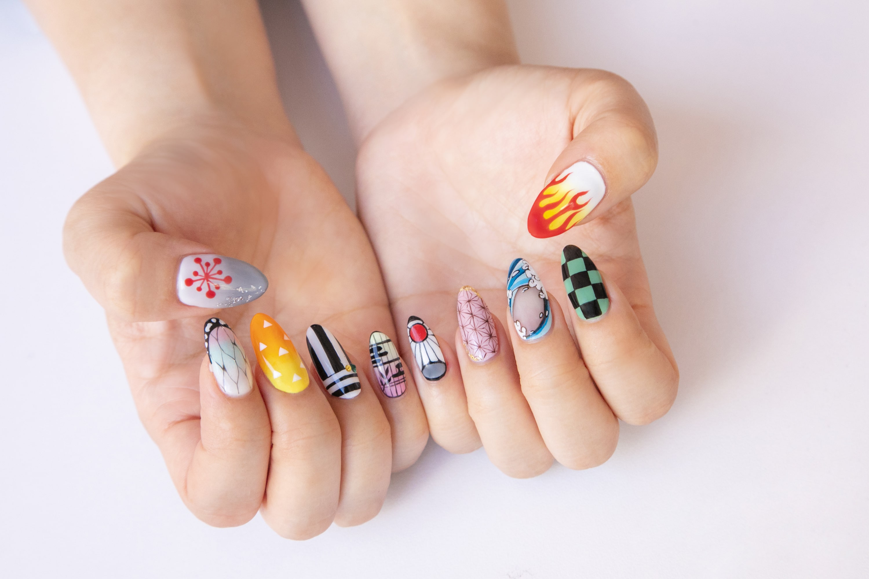 今回は人気の『鬼滅の刃』をテーマに、味方のキャラクターのモチーフで揃えました。この作品は、作者の先生がキャラクターに対して柄や色をしっかり決めているので、パッと見て誰かわかる柄をピックアップしています。また、大正がテーマなので、ポイントで金箔を入れて和の要素を加えています。あとは、自分の中で楽しめるポイントなんですけど、どのキャラをどの指に描くかっていうのは、キャラクター同士の関係を考えながら配置しました!