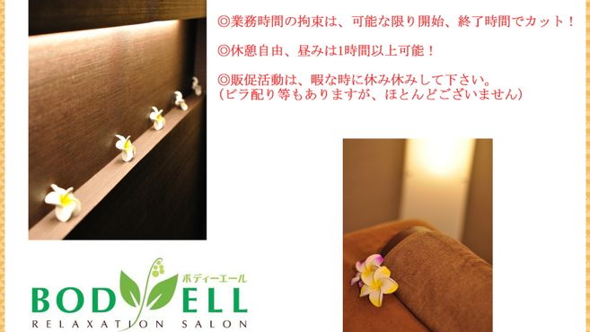 BODYELLに応募したのは、まず「地域密着」のリラクゼーションサロンだったからです。お客様1人1人と向き合い、信頼関係を作っていくことを、私自身とても大切に思っているので、そこに惹かれました。そして、労働環境がしっかりしているところです。休憩はまとめて1時間以上、好きなときに取れるので、身体に無理なく働くことができます。サイトを見て募集がありましたが、もっと店の事が知りたくて応募後に現場見学会にも参加し、店の事がわかり安心して入社致しました。入った後で良かった点は、スタッフの皆が優しく、仲が良いところです。新しい環境で働くことは初めは不安でしたが、分からないことは優しく丁寧に教えて下さる先輩方に助けられています。仕事の話だけでなく、プライベートな話もしますが、いつも笑いが絶えません。そんな雰囲気の良さが、とても気に入っています。ご検討よろしくお願いいたします。