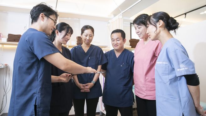 本院の魅力は「設備」や「空間」だけではありません。ここで働くスタッフは皆、患者様に真摯に向き合いながらも、仲間同士で支え合う温かい雰囲気を大切にしています。新人スタッフも安心して成長できるように、日常の中で先輩がさりげなくフォローしてくれる文化があります。技術指導はもちろん、患者様への接し方や施術の流れも実践的に学べるため、短期間で自信を持って臨床に立てるようになります。