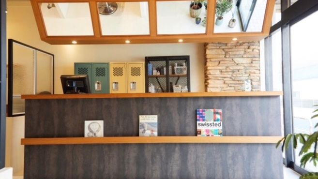 大きな窓から柔らかな陽光が差し込む受付は、nilsのこだわりが詰まった空間です。深みのある木のカウンターと鮮やかなグリーンたちが、お客様とスタッフを温かく迎え入れます。