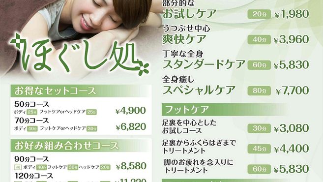 露天風呂やジェットバスなど9種類のお風呂と2種類のサウナを備えた温浴施設内リラクゼーションサロンです。