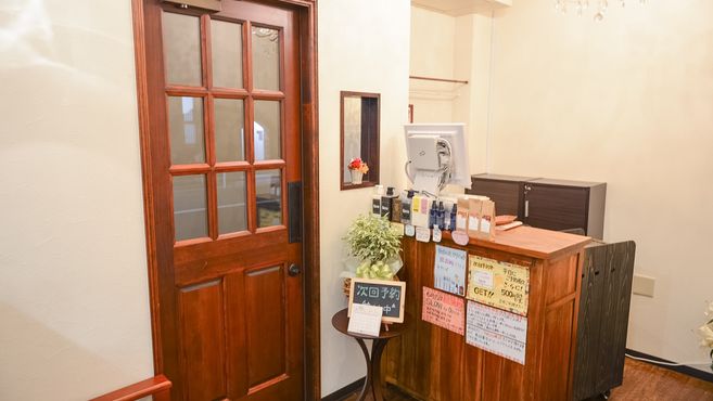 「ただいま」と言いたくなる、木の温もり溢れる受付。 サロンコンセプトは『実家に帰ってきたようなくつろげる空間』。アンティーク調の落ち着いたインテリアと優しい照明が、働くスタッフの心も癒やしてくれます。